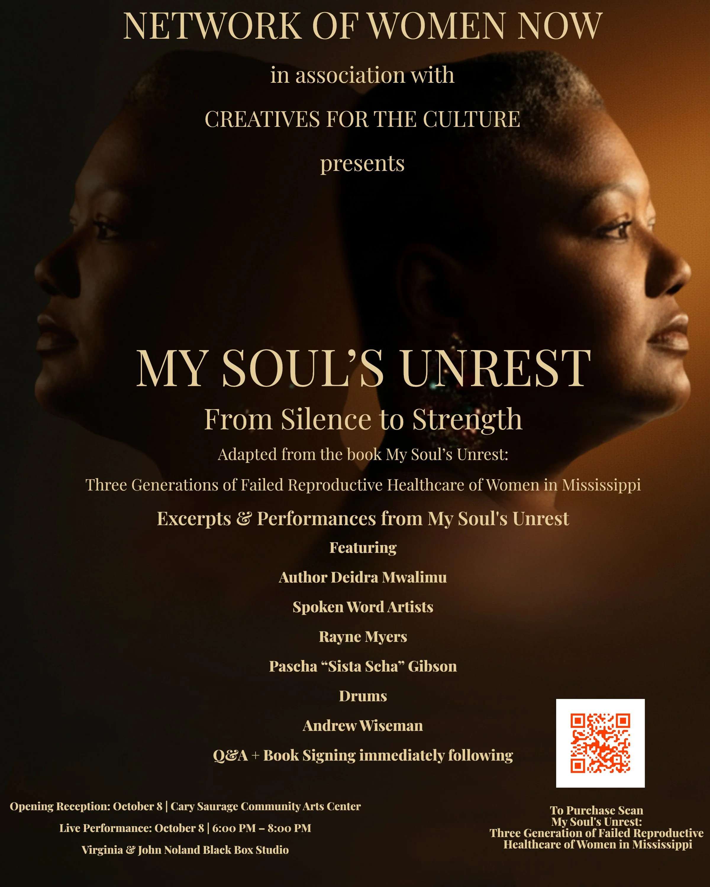 A live dramatic readings from author and Executive Director Deidra Mwalimu’s groundbreaking book, My Soul’s Unrest: Three Generations of Failed Reproductive Healthcare of Women in Mississippi.